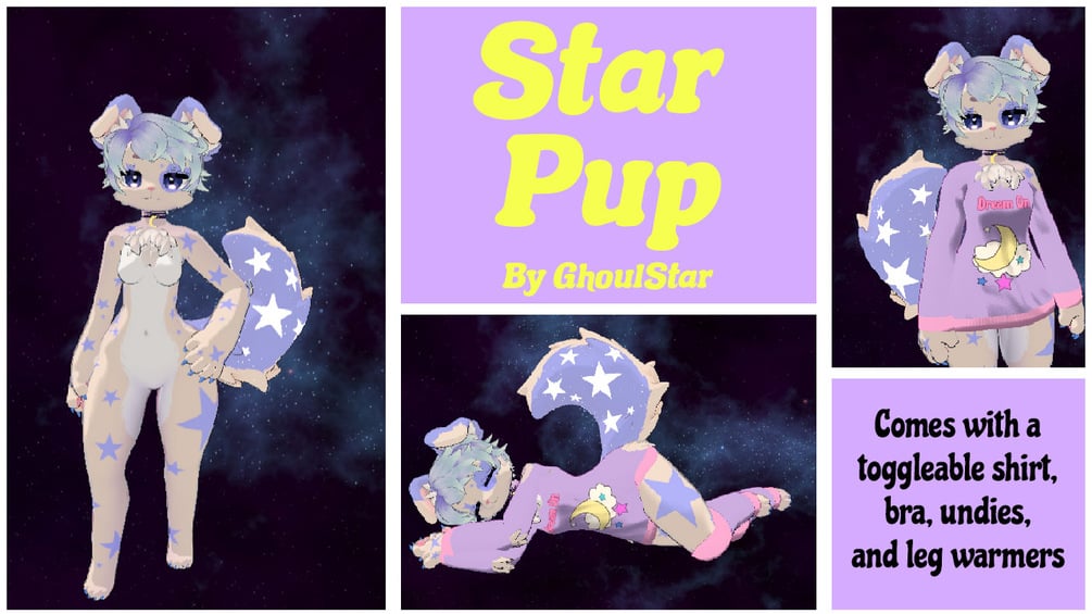Say hello to Star Pup! Her star spotted fur shines bright at night and she loves wearing her big cozy Dream shirt.